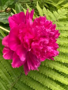Die Pfingstrose harmoniert mit dem Farn.